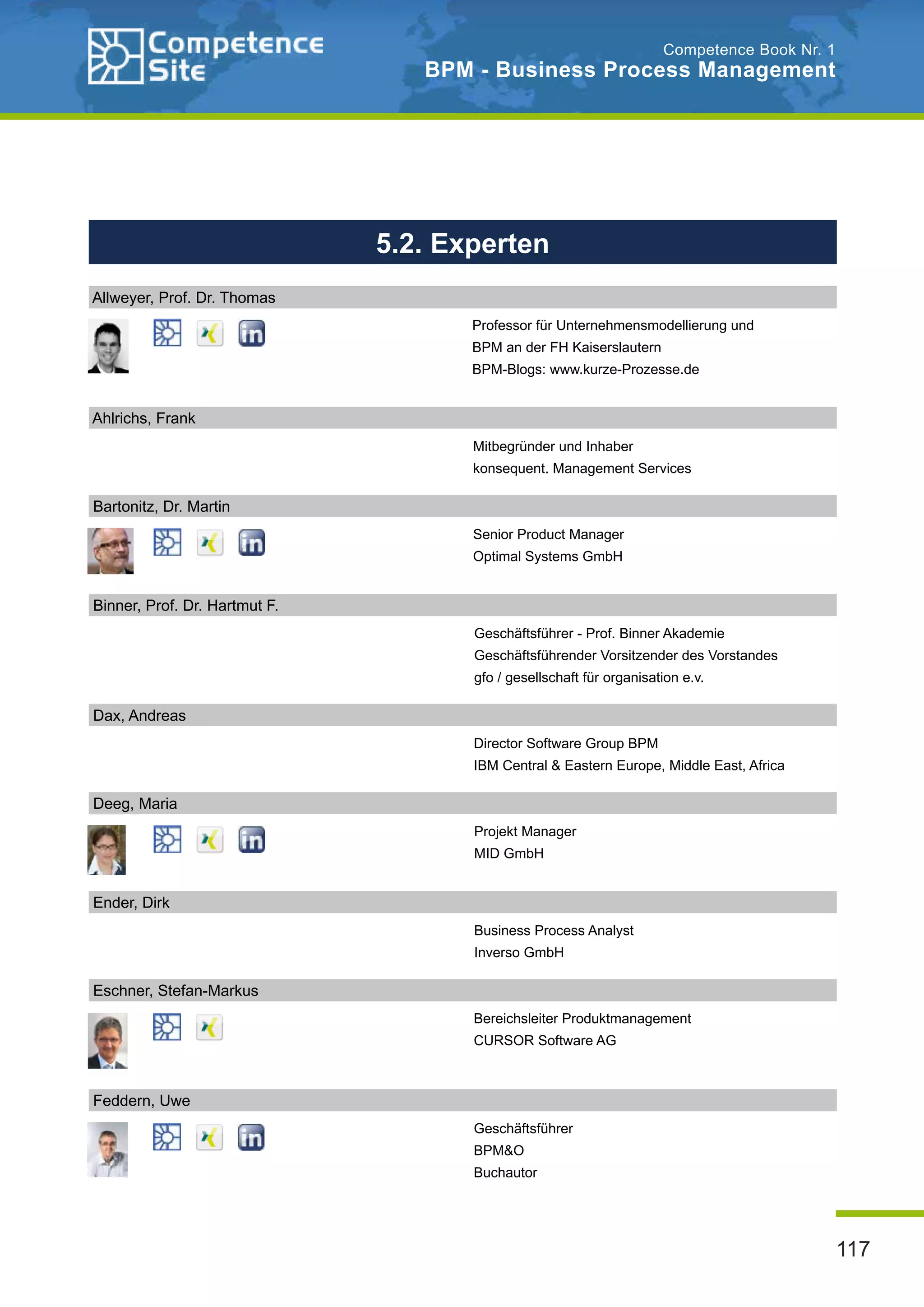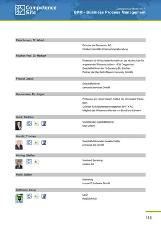 Das Dokument ist ein Kompetenzbuch über Business Process Management (BPM) und listet eine Vielzahl von Experten und Unternehmen auf, die auf diesem Gebiet tätig sind. Es werden verschiedene Ansätze, Lösungen und Dienstleistungen vorgestellt, die sich auf die Optimierung von Geschäftsprozessen konzentrieren. Zudem wird die Wichtigkeit der Integration von Prozessen, Organisation und IT hervorgehoben, um erfolgreiches Prozessmanagement zu gewährleisten.