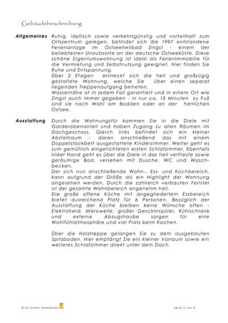 Das Dokument beschreibt eine große Maisonette-Wohnung mit drei Schlafzimmern in Zingst, die ideal für die Vermietung oder Selbstnutzung ist. Die Wohnung erstreckt sich über zwei Etagen, hat eine Wohnfläche von etwa 67 m2 und wird durch eine Gas-Zentralheizung beheizt. Der Kaufpreis beträgt 165.000 € zuzüglich einer Käuferprovision von 5,95 %.