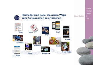 Das Dokument untersucht die wachsende Nutzung von Smartphones und deren Einfluss auf das Konsumverhalten, wobei 91% der Smartphone-Benutzer lokale Informationen suchen und aktiv werden. Zusätzlich wird die Rolle von QR-Codes und mobilen Apps in Marketing und Verkauf hervorgehoben, die eine Brücke zwischen digitaler und physischer Welt schlagen. Insgesamt wird das Smartphone als unverzichtbares Werkzeug für das moderne Einkaufen und die Interaktion mit Marken präsentiert.
