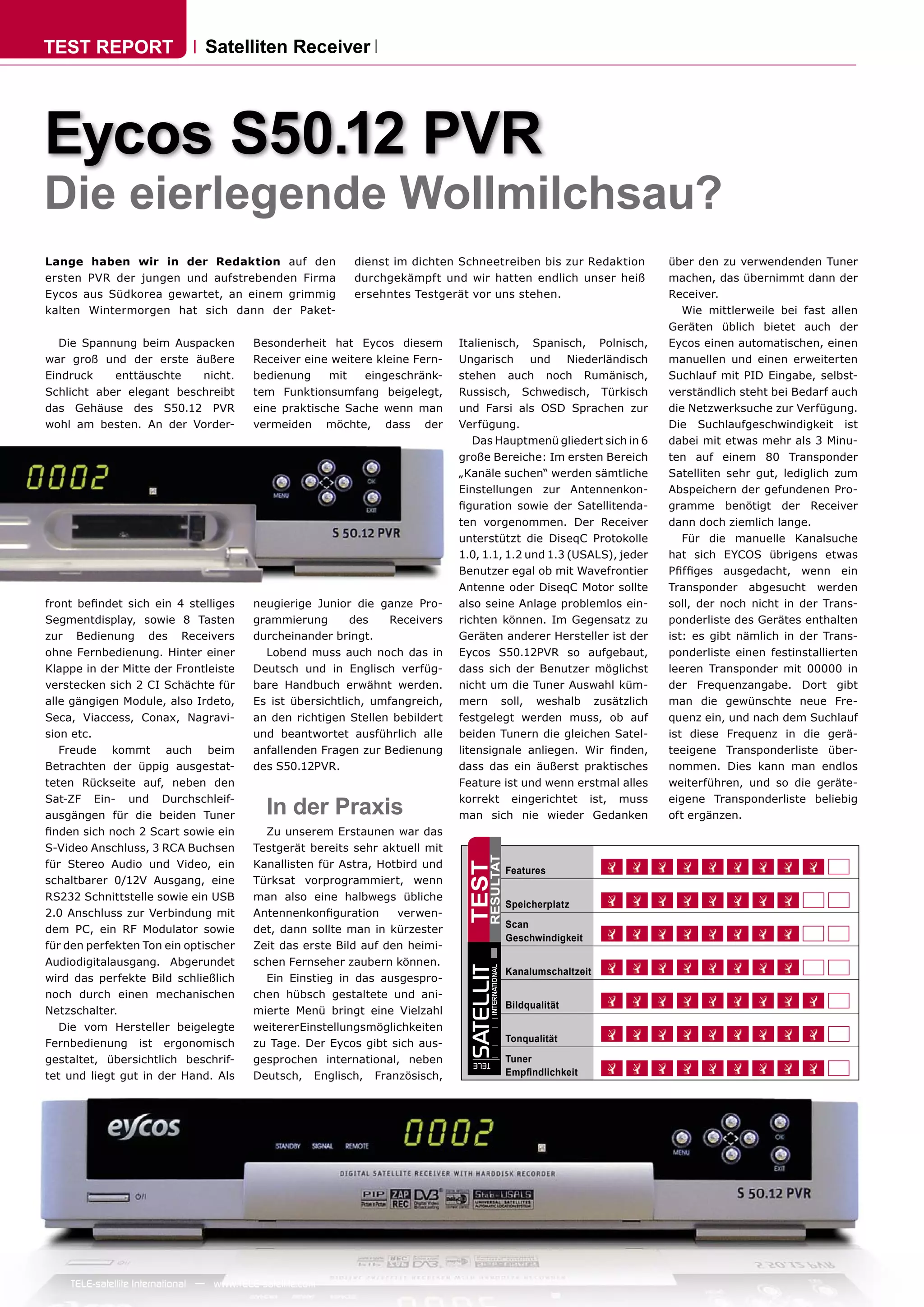 Der Eycos S50.12 PVR ist ein vielseitiger und benutzerfreundlicher Satellitenreceiver, der in Tests aufgrund seiner leistungsstarken Funktionen, wie der Fähigkeit, mehrere Programme simultan aufzuzeichnen, und einem schnellen USB 2.0-Anschluss, positiv hervorsticht. Er verfügt über eine umfangreiche Senderverwaltung und bietet Unterstützung für verschiedene CI-Module sowie mehrere Ton- und Videoausgabemöglichkeiten. Dennoch gibt es kleinere Softwareprobleme, die verbessert werden könnten, um die Benutzererfahrung weiter zu verbessern.