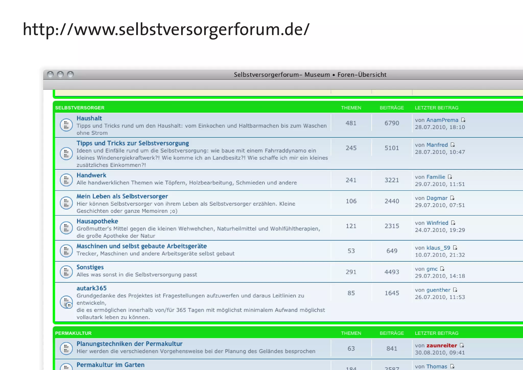 Das Dokument listet verschiedene Websites und Foren auf, die sich mit Selbstversorgung, Urban Gardening und Gartenkalendern beschäftigen. Die aufgeführten Seiten bieten Informationen, Ressourcen und Gemeinschaften für Gärtner und Interessierte an nachhaltiger Lebensmittelproduktion. Es umfasst auch Plattformen zur Förderung des Anbaus von Pflanzen und zum Teilen von Ressourcen.