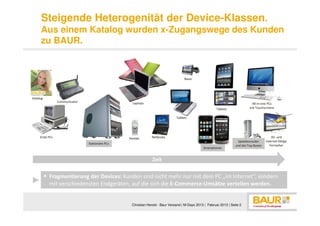 Das Dokument von Christian Herold erläutert die zunehmende Heterogenität der Endgeräte im E-Commerce und die Notwendigkeit neuer Multi-Device-Plattformstrategien. Es wird aufgezeigt, dass mobile Geräte einen wachsenden Anteil an den Online-Besuchen und Umsätzen von baur.de haben, während die Anforderungen an Nutzererlebnis und technische Umsetzung steigen. Zudem werden die Erfolge von Maßnahmen wie dem Autologin und der Optimierung der Ladezeiten für mobile Seiten thematisiert.