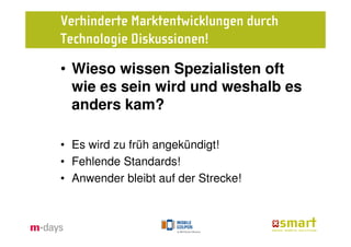 Das Dokument behandelt die Herausforderungen und Entwicklungen im Bereich des mobilen Marketings, insbesondere durch Technologien wie NFC und SMS. Es werden Trends und Bedürfnisse der Endnutzer im Bezug auf mobile Coupons und Loyalitätsprogramme diskutiert, sowie die Wichtigkeit von hybriden Multi-Channel-Strategien für den Erfolg. Des Weiteren werden Anwendungsbeispiele und der Einsatzbereich in verschiedenen Branchen erläutert, einschließlich der Akzeptanz und der hohen Einlösequoten von Coupons.