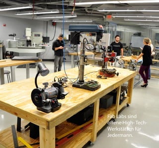 Fablabs sind offene High-Tech-Werkstätten, die Zugang zu digitalen Fertigungstechnologien bieten und von Neil Gershenfeld initiiert wurden, um individuelle Produktionsmöglichkeiten zu fördern. Diese Einrichtungen unterstützen nicht nur private Projekte, sondern auch soziale Initiativen und Bildung, indem sie Selbsthilfe und kreatives Arbeiten ermöglichen. Fablabs bilden ein globales Netzwerk, das Ressourcen und Know-how teilt, wobei jeder Zugang hat und Sicherheits- sowie Betriebspflichten einhält.