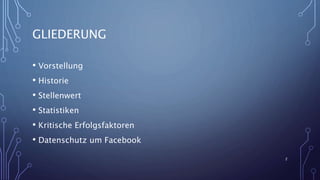 Das Dokument beschreibt die Entwicklung und den Einfluss von Facebook, einem der größten sozialen Netzwerke mit 1,32 Milliarden Nutzern weltweit. Es behandelt die Unternehmensgeschichte, den Stellenwert für die Nutzer, kritische Erfolgsfaktoren sowie datenschutzrechtliche Herausforderungen, die Facebook seit seiner Gründung begleiten. Besonders betont werden die Risiken hinsichtlich Datenschutz und die Beziehungen zu Sicherheitsbehörden.