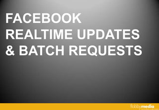 Das Dokument behandelt die Implementierung von Echtzeit-Updates und Batch-Anfragen über die Facebook Graph API für Anwendungen, um Benutzern sofortige Benachrichtigungen zu ermöglichen, wenn zum Beispiel Freunde sich registrieren. Es werden verschiedene Schritte zur Einrichtung eines Endpunkts, zur Abonnierung von Änderungen und zur Verarbeitung von Updates beschrieben, während auch Herausforderungen und Sicherheitsmaßnahmen hervorgehoben werden. Zudem wird auf die Möglichkeiten von Batch-Anfragen eingegangen, um die Effizienz bei der Datenabfrage zu steigern.