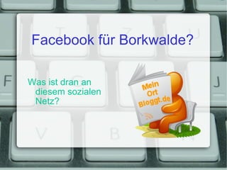 Der Vortrag bietet einen Überblick über Facebook, einschließlich seiner Struktur, Funktionalitäten und Datenschutzfragen. Es wird erläutert, warum Facebook für viele Nutzer attraktiv ist und welche Rolle es in sozialen Bewegungen spielt. Zudem wird diskutiert, ob eine Facebook-Seite für die Gemeinde Borkwalde sinnvoll sein könnte.