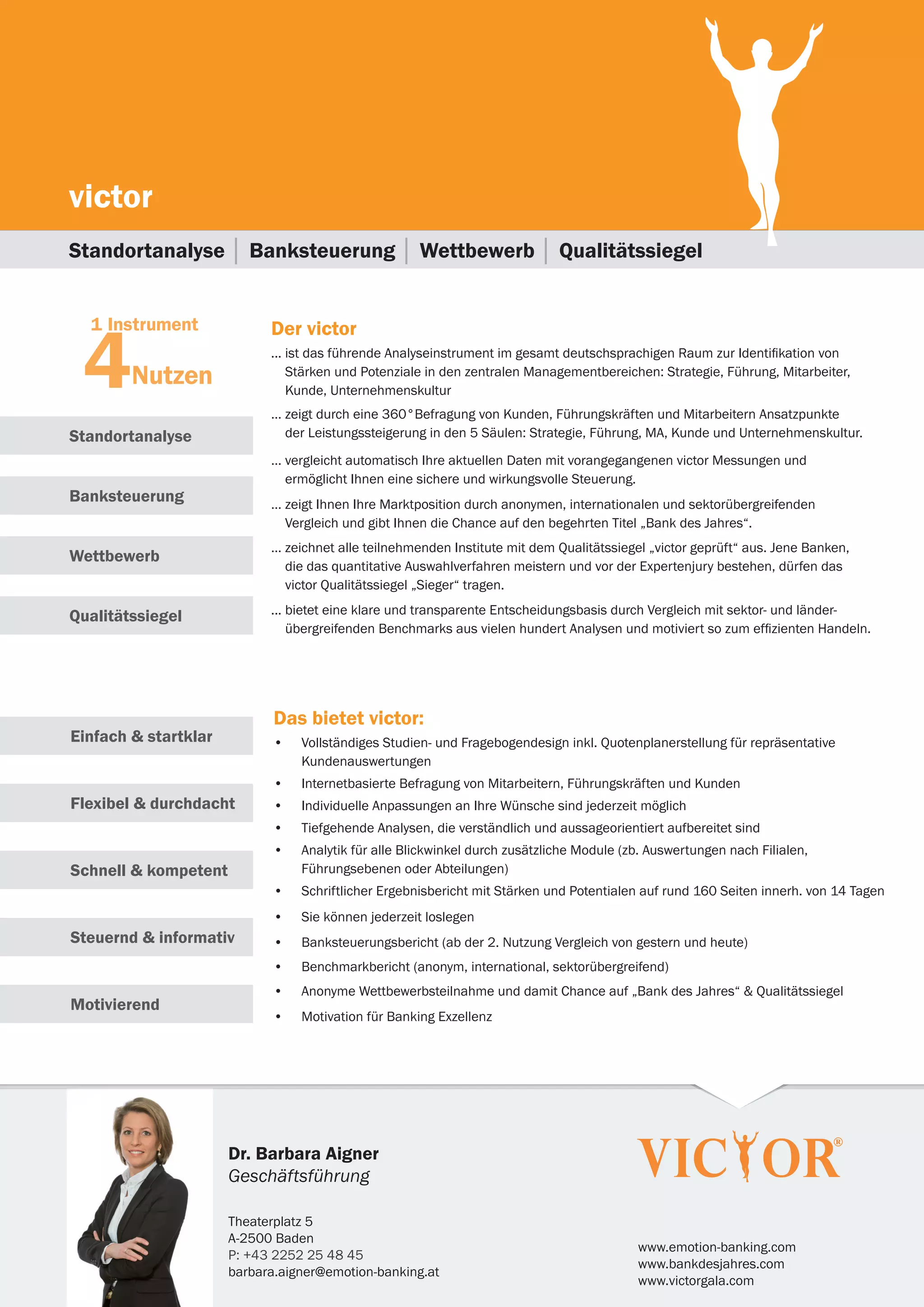 Victor ist ein führendes Analyseinstrument zur Identifikation von Stärken und Potenzialen in zentralen Managementbereichen wie Strategie und Unternehmenskultur durch 360°-Befragungen. Es bietet eine umfassende Marktanalyse, ermöglicht Vergleiche und zeichnet teilnehmende Banken mit einem Qualitätssiegel aus, das die Chance auf den Titel 'Bank des Jahres' beinhaltet. Das Programm umfasst verschiedene Module und maßgeschneiderte Analysen sowie Berichtserstellungen, die Transparenz und Handlungsempfehlungen bieten.