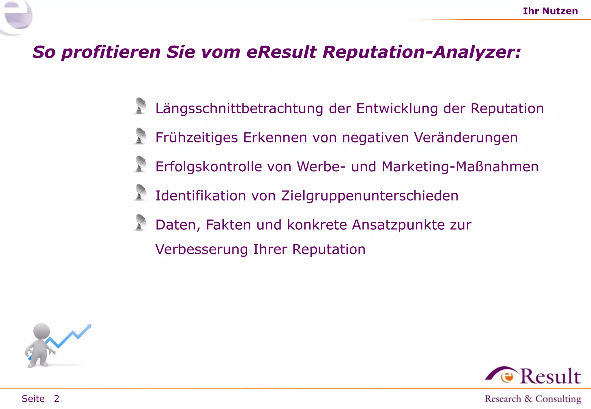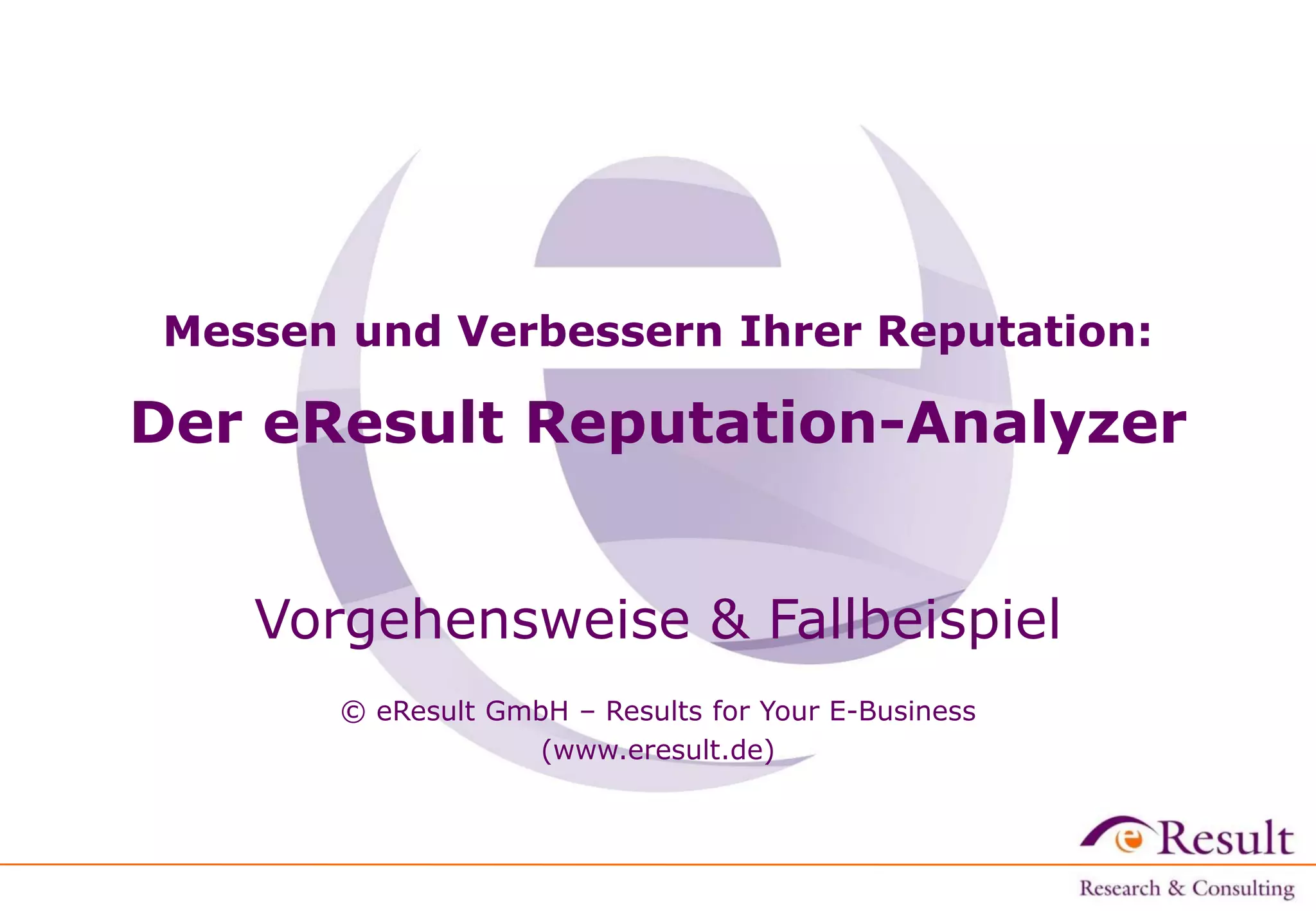 Das Dokument beschreibt den Eresult Reputation-Analyzer, der Unternehmen hilft, ihre Online-Reputation zu messen und zu verbessern. Ein Fallbeispiel zeigt, wie das Kartoffelhotel in der Lüneburger Heide die Wahrnehmung seiner Online-Präsenz durch eine Umfrage von 1.300 Personen analysierte und durch gezielte Maßnahmen die Kundenzufriedenheit und Buchungsabsicht steigerte. Der Analyzer bietet wissenschaftlich fundierte Daten zur Glaubwürdigkeit, Sympathie und Kompetenz und unterstützt Unternehmen bei der erfolgreichen Optimierung ihrer Online-Strategien.
