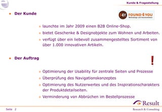 Das Dokument beschreibt eine Fallstudie zur Optimierung der Benutzererfahrung eines B2B-Onlineshops, der 2009 gegründet wurde. Die Analyse führte zu 48 spezifischen Empfehlungen zur Verbesserung der Usability und der Navigation, um Abbrüche im Bestellprozess zu vermindern. Die Ergebnisse wurden innerhalb von 5 Tagen nach Projektstart präsentiert, und es wird eine kontinuierliche Beratung angeboten, um die Nutzerzufriedenheit zu erhöhen.