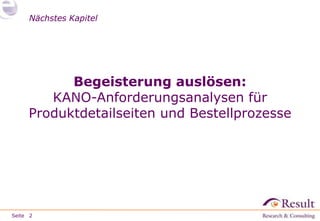 Das Dokument beschreibt eine Anforderungsanalyse mit dem Kano-Modell, die auf Produktdetailseiten und Bestellprozesse abzielt, um die Zufriedenheit von Kunden und Nicht-Kunden zu steigern. Insgesamt wurden mehrere tausend Kunden befragt, um relevante Wünsche und Elemente zu identifizieren, die den Unternehmenserfolg sichern. Die Ergebnisse zeigen, welche Funktionen priorisiert umgesetzt werden sollten, um Ressourcen effektiv einzusetzen.