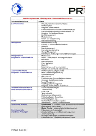 Die Donau-Universität Krems bietet berufsbegleitende Masterstudiengänge in PR und integrierter Kommunikation sowie Kommunikation und Management an, wobei die Programme in Deutschland von der PR Plus GmbH betreut werden. Die beiden Studiengänge unterscheiden sich in ihrer inhaltlichen Ausrichtung, wobei PR und integrierte Kommunikation praxisorientierter ist, während Kommunikation und Management stärker betriebswirtschaftlich fokussiert ist. Der Abschluss wird von der Donau-Universität Krems verliehen und ermöglicht bei Erfüllung der ECTS-Punkte auch eine Promotion.