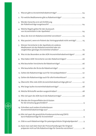Das Dokument erläutert die AOK-Arzneimittelrabattverträge, die aufgrund steigender Medikamentenausgaben eingeführt wurden, um Kosten zu senken und die Medikamentenverfügbarkeit zu sichern. Diese Verträge betreffen überwiegend Generika und ermöglichen es, dass Apotheken bei der Abgabe von Arzneimitteln oft die günstigeren, vertragsgebundenen Produkte bevorzugen. Die positiven Effekte der Rabattverträge auf die Therapieadhärenz der Patienten und die Kostenersparnisse für die AOK und ihre Versicherten werden ebenfalls hervorgehoben.