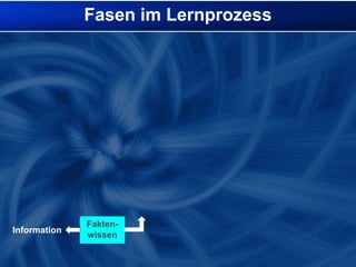 Das Dokument behandelt die Phasen im Lernprozess, insbesondere das Faktenwissen, das deklarativ und statisch ist und in ein Netzwerk von wissensabhängigen Fakten eingebettet ist. Es betont die Wichtigkeit des Kontexts beim Verstehen von Informationen und wie Fragen das notwendige Wissen für die Lernenden strukturieren. Zudem wird auf fehlerhafte Lernmuster und den Übergang zu fehlerfreien Lernmustern eingegangen.