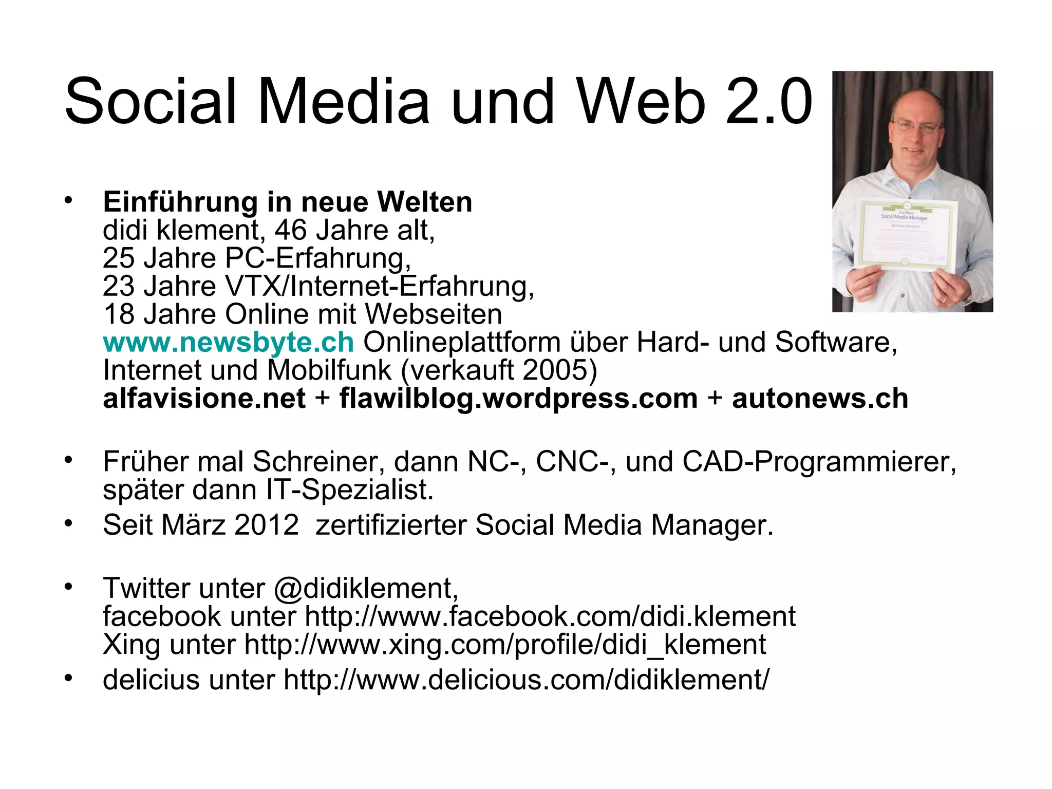Das Dokument bietet eine umfassende Einführung in Social Media und Web 2.0, einschließlich der Unterschiede zu Web 1.0 und Web 3.0. Es betont die Bedeutung von Sicherheit im Internet, das Schutzbedürfnis von Kindern sowie die Risiken von Online-Mobbing und Identitätsmissbrauch. Zusätzlich werden grundlegende Plattformen wie Facebook und Google+ sowie wichtige Aspekte der Nutzung und der Nutzerbedingungen vorgestellt.