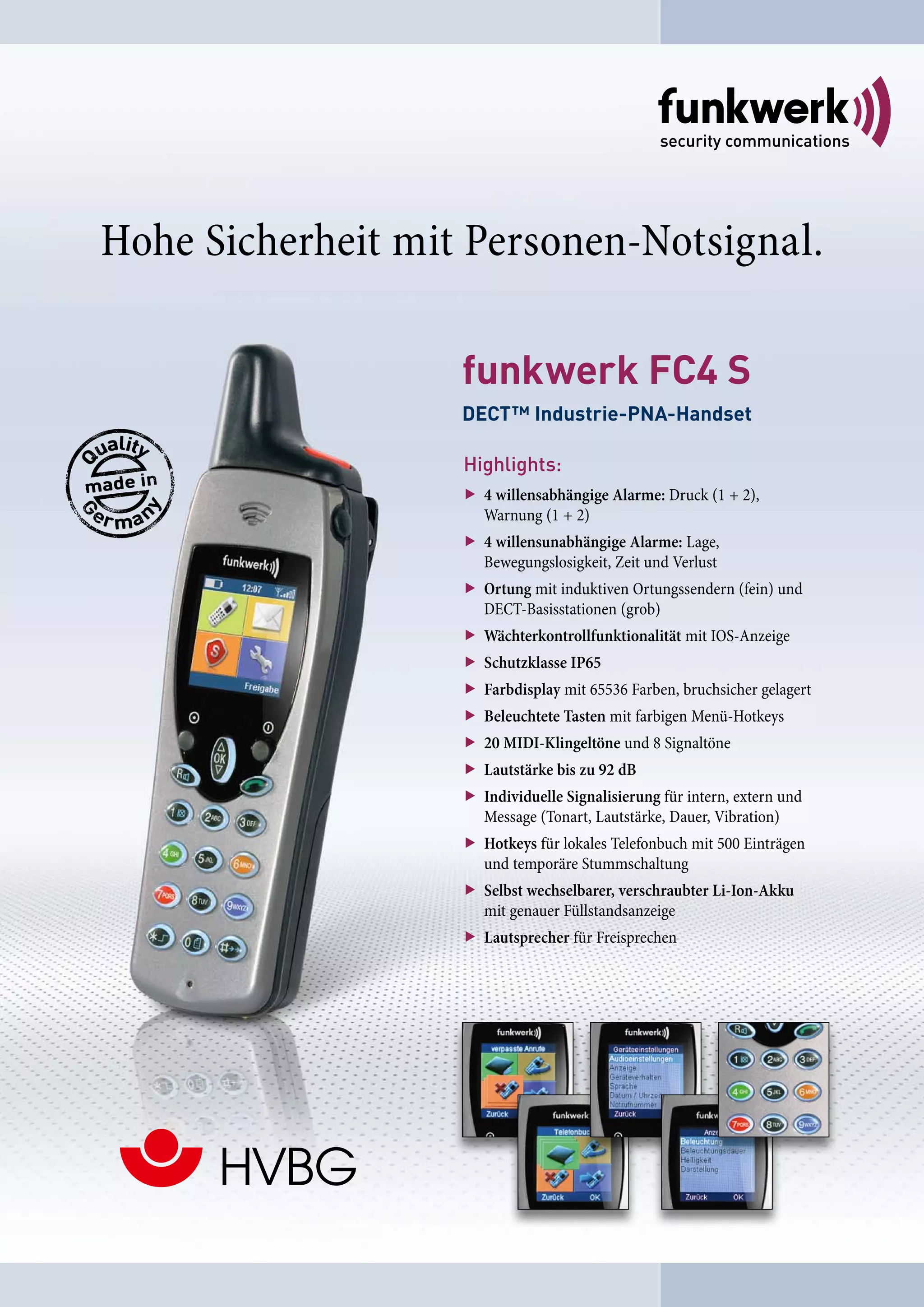 Das Dokument beschreibt das funkwerk fc4 s dect™ Industrie-PNA-Handset, das über eine hohe Sicherheit mit verschiedenen Alarm- und Ortungsfunktionen verfügt. Es bietet eine robuste Bauweise mit IP65-Schutzklasse, leuchtendem Farbdisplay und umfassenden Kommunikationsmöglichkeiten. Zudem sind Anpassungen und Zubehör für eine ergonomische Nutzung vorgesehen.