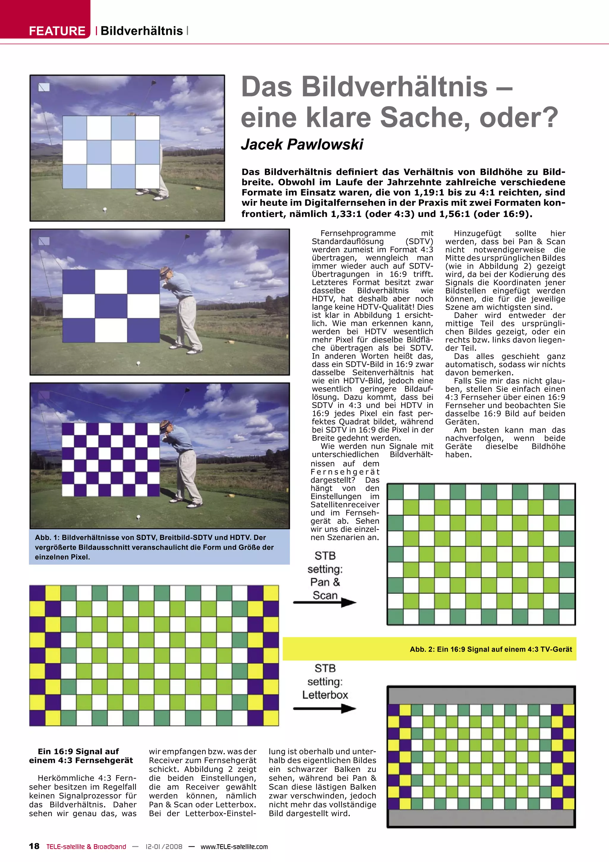 Das Dokument behandelt das Bildverhältnis im Fernsehen und definiert die gängigen Formate 4:3 und 16:9. Es erläutert die Unterschiede in der Bildqualität und -darstellung zwischen Standardauflösung (SDTV) und High Definition (HDTV) sowie die Auswirkungen von verschiedenen Receiver-Einstellungen wie 'letterbox' und 'pan & scan'. Weiterhin wird auf die Probleme eingegangen, die bei der Übertragung von Filmformaten im 4:3-Signal auftreten können.