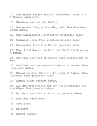 Das Dokument listet 100 Dinge auf, die man im Leben getan haben sollte, darunter vielfältige Erfahrungen wie Reisen, persönliche Herausforderungen und lustige sowie risikobehaftete Aktivitäten. Die Liste reicht von Abenteuern, wie dem Schwimmen mit Delfinen, bis zu alltäglichen Handlungen, wie einem Baum zu pflanzen oder zu heiraten. Diese Punkte sollen dazu anregen, das Leben in vollen Zügen auszukosten und unvergessliche Erinnerungen zu schaffen.