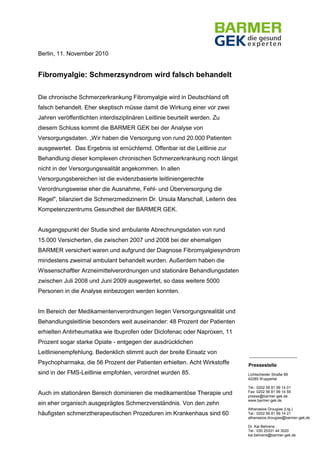 Die Studie der Barmer GEK zeigt, dass die Behandlung von Fibromyalgie in Deutschland häufig nicht den evidenzbasierten Leitlinien entspricht. Anhand von Daten von 20.000 Patienten wird deutlich, dass viele Betroffene unangemessene Medikamente erhalten und invasive Verfahren dominieren, während multimodale Therapien vernachlässigt werden. Experten schätzen, dass etwa 2% der Erwachsenen an dieser schmerzhaften Erkrankung leiden, wobei Frauen überdurchschnittlich betroffen sind.