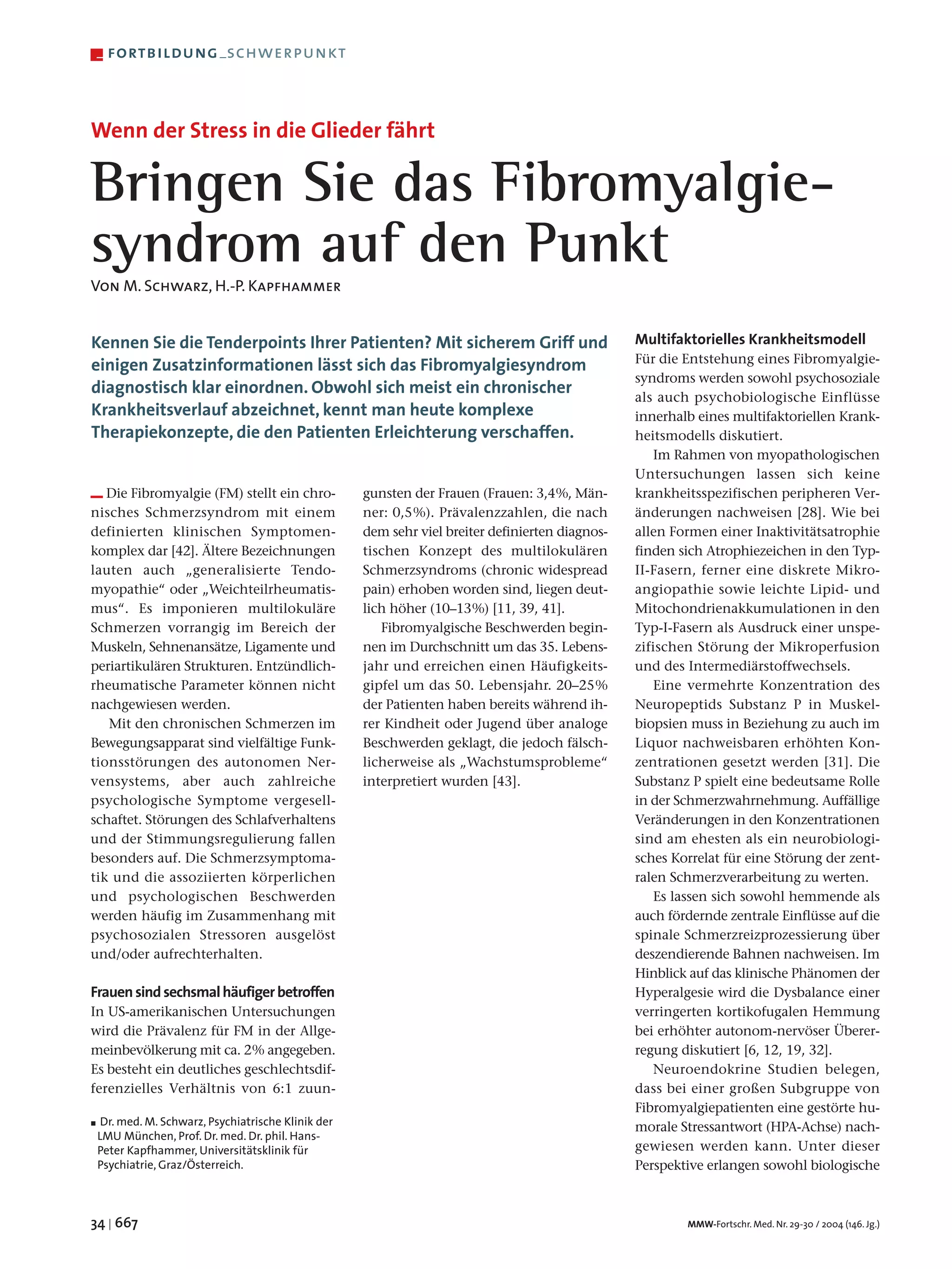 Das Dokument behandelt das Fibromyalgie-Syndrom als komplexe, multifaktorielle Erkrankung, die durch generalisierte Schmerzen und psychosoziale Einflüsse gekennzeichnet ist. Es werden diagnostische Kriterien, neurobiologische und psychologische Zusammenhänge sowie therapeutische Ansätze zur Linderung der Symptome diskutiert. Die häufigere Betroffenheit von Frauen und die Notwendigkeit einer sorgfältigen Differenzialdiagnose werden hervorgehoben.
