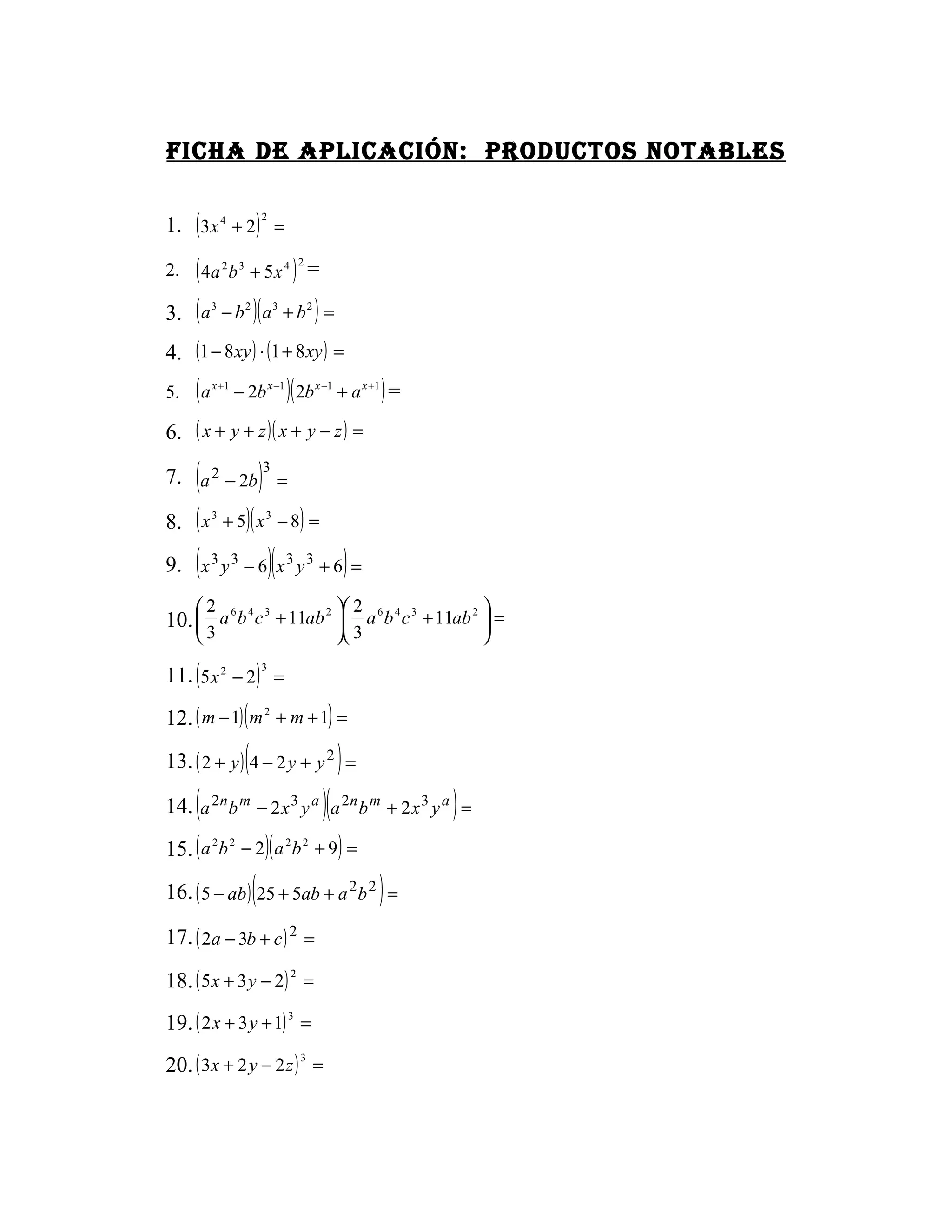 Das Dokument enthält eine Liste von mathematischen Anwendungen und Formeln, die verschiedene algebraische Ausdrücke wie Produkte, Summen und Potenzen darstellen. Es werden verschiedene Identitäten und Faktorisierungen vorgestellt, die zur Vereinfachung oder Lösung von Mathematikproblemen verwendet werden können. Jede Zeile präsentiert eine spezifische Rechenoperation ohne weitere Erklärungen oder Kontext.