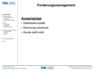 Der Vortrag von Rechtsanwalt Christoph Kluss auf der FileMaker Konferenz 2014 in Winterthur behandelt die Grundlagen des Forderungsmanagements bei Schutzrechtsverletzungen und Inkasso. Er behandelt Themen wie die Abgrenzung von Werkverträgen, die Mahnung, den Verzug, sowie gerichtliche Schritte zur Durchsetzung von Zahlungsansprüchen und die sinnvolle Abwicklung von Forderungen. Die Präsentation bietet einen strukturierten Überblick über die rechtlichen Rahmenbedingungen und praktischen Vorgehensweisen im Forderungsmanagement.