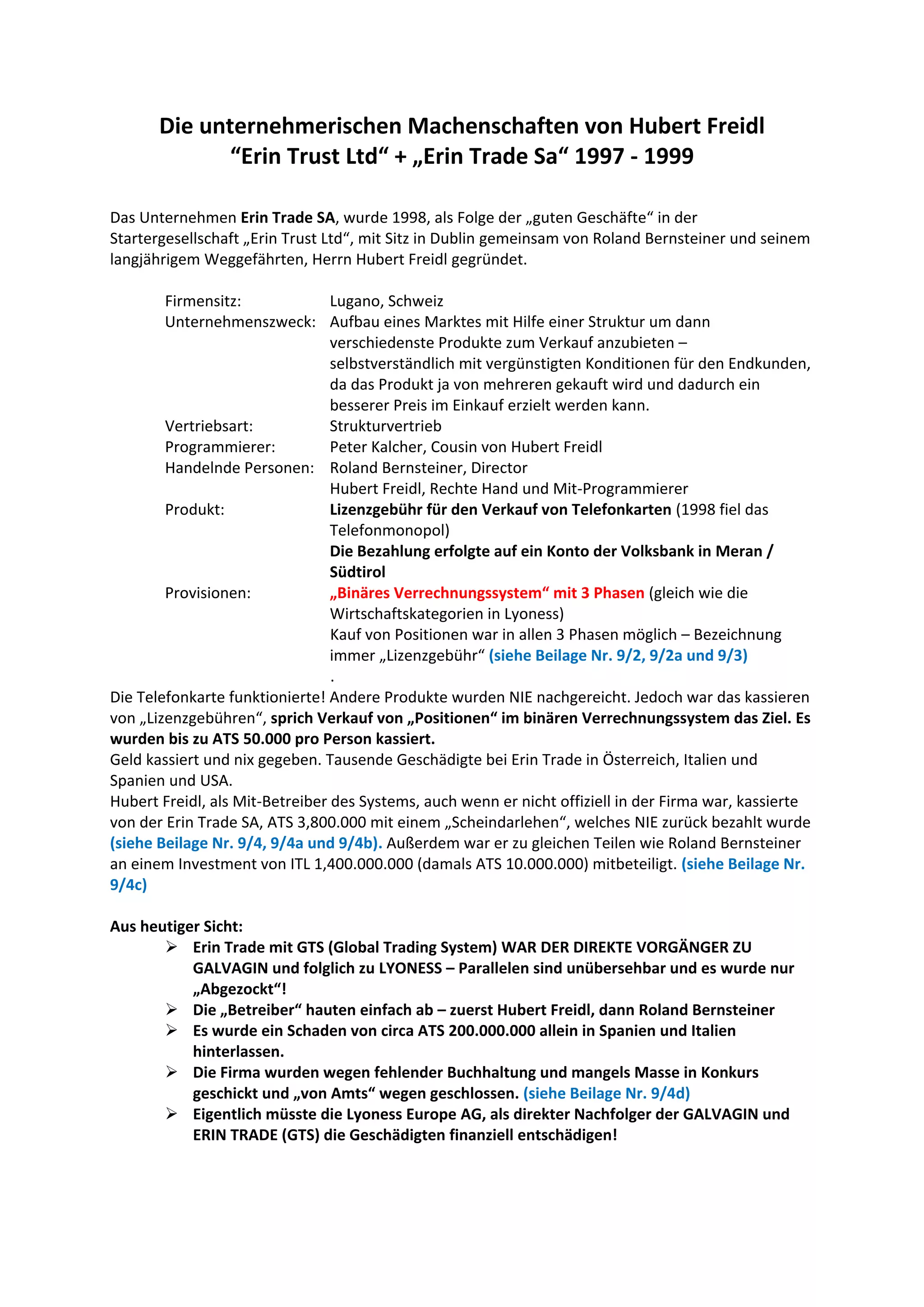 Das Dokument beschreibt die unternehmerischen Machenschaften von Hubert Freidl und Roland Bernsteiner im Zusammenhang mit Erin Trust Ltd und Erin Trade SA zwischen 1997 und 1999, die ein binäres Verrechnungssystem zur Lizenzgebühr für Telefonkarten etablierten, jedoch keine weiteren Produkte lieferten. Tausende Menschen in mehreren Ländern wurden geschädigt, während Freidl und Bernsteiner hohe Beträge kassierten, ohne ihren Verpflichtungen nachzukommen. Das Unternehmen wurde schließlich wegen mangelnder Buchhaltung geschlossen, und es wird gefordert, dass Lyoness Europe AG als Nachfolger die Geschädigten entschädigt.