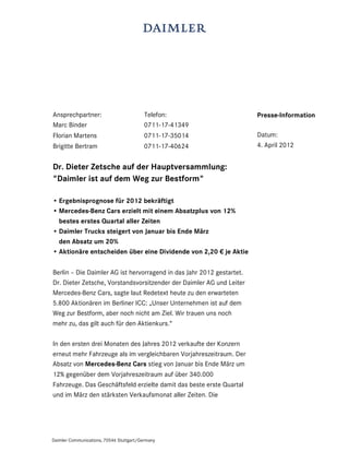 Daimler AG hat stark ins Jahr 2012 gestartet, mit einem Absatzplus von 12% bei Mercedes-Benz Cars und einer positiven Prognose für den Gesamtabsatz. Der Vorstandsvorsitzende Dr. Dieter Zetsche bekräftigte, dass das Unternehmen auf dem Weg zur 'Bestform' sei und rechnet mit weiterem Wachstum durch Innovationen, insbesondere im Bereich nachhaltiger Technologien. Für 2012 wird ein EBIT auf hohem Niveau sowie eine Dividende von 2,20 € je Aktie vorgeschlagen, basierend auf den Rekordergebnissen des Vorjahres.