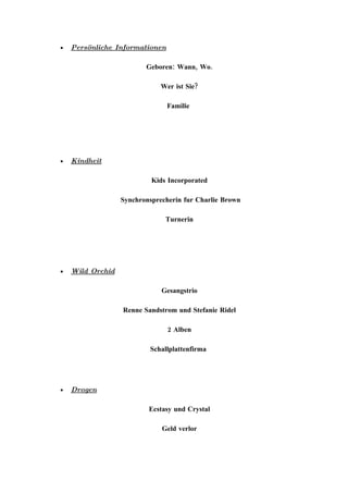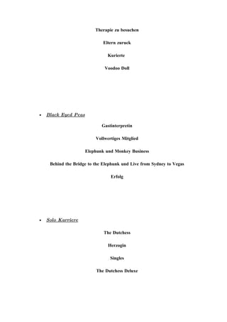Das Dokument beschreibt das Leben und die Karriere von Fergie, einschließlich ihrer Kindheit, ihrer Zeit bei den Black Eyed Peas und ihrer Solokarriere mit dem Album 'The Dutchess'. Es erwähnt ihre persönlichen Herausforderungen mit Drogen, ihr Engagement für Wohltätigkeitsarbeit und ihre Erfolge, wie die meistverkaufte Download-Single in den USA. Zudem wird ihre Beziehung zu Josh Duhamel und ihre Auftritte in Deutschland hervorgehoben.