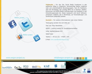 Das wegov-Projekt zielt darauf ab, die Verbindung zwischen Politik und Bürgern über soziale Netzwerke zu stärken und bietet eine Toolbox zur Analyse von Social-Media-Daten. Diese Toolbox ermöglicht es der Politik, Meinungen zu identifizieren und Nutzerverhalten zu analysieren, um eine informierte Entscheidungsfindung zu fördern. Die Entwicklung erfolgt durch den Austausch mit verschiedenen Nutzergruppen aus dem politischen Spektrum, unterstützt von der Europäischen Kommission.