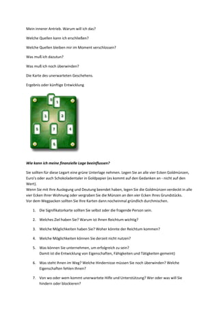 Das Dokument behandelt Legemuster zur Analyse finanzieller Möglichkeiten und gibt Hinweise, wie man eigene Talente gewinnbringend einsetzen kann, um die finanzielle Situation zu verbessern. Es ermutigt dazu, die Karten für persönliche Einblicke und anpassbare Fragestellungen zu nutzen, um verschiedene Aspekte der finanziellen Lage zu beleuchten. Zudem werden praktische Tipps für das Legen der Karten und die Definition von Zielen gegeben, um den Umgang mit Geld zu optimieren.