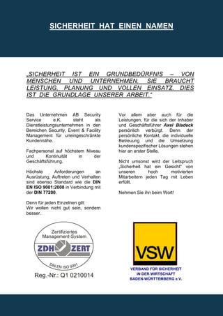 Die AB Security Service e.K. bietet umfassende Sicherheitsdienstleistungen in den Bereichen Security, Event und Facility Management an, wobei die individuelle Kundenbetreuung und die Qualifikation der Mitarbeiter im Fokus stehen. Das Unternehmen legt großen Wert auf modernste Technik und kontinuierliche Weiterbildung seiner Mitarbeiter, um maßgeschneiderte Sicherheitslösungen zu garantieren. Neueste Entwicklungen beinhalten ein innovatives Notrufsystem für Kinder und Senioren, das eine lückenlose Sicherheitsüberwachung ermöglicht.