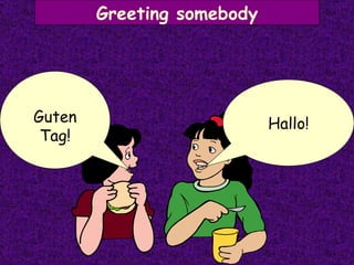 Das Dokument enthält einen Dialog, der grundlegende Begrüßungen und Fragen umfasst, wie Name, Alter und Wohnort. Es beschreibt auch die Antworten auf diese Fragen, einschließlich Informationen über Berlin und Wien. Abschließend werden Tschüss und Auf Wiedersehen als Abschiedsformeln erwähnt.