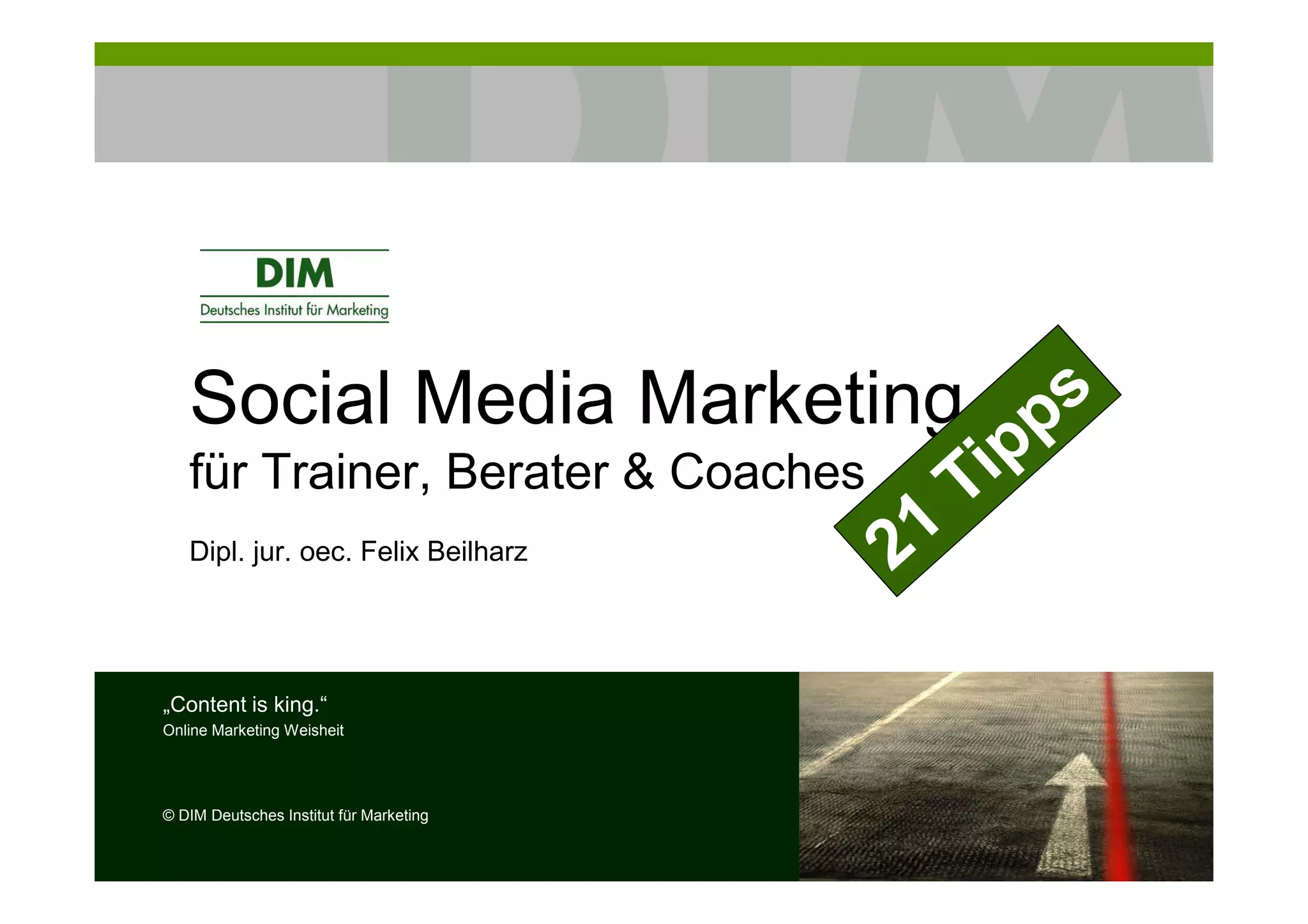 Das Dokument behandelt Social Media Marketing für Trainer, Berater und Coaches und gibt einen Überblick über Strategien und Tools zur Kundenbindung über Plattformen wie Facebook und Twitter. Es werden verschiedene Tipps gegeben, um Inhalte zu veröffentlichen und deren Reichweite zu erhöhen, dabei wird die Bedeutung einer strategischen Herangehensweise betont. Zusätzlich werden spezifische Tools und Techniken empfohlen, um die Effektivität der Social Media Aktivitäten zu messen und zu optimieren.