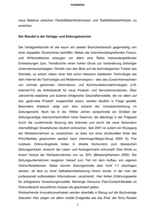 Das Dokument thematisiert die Herausforderungen und Veränderungen in der Verlags- und Medienwirtschaft, die durch technologische Entwicklungen und einen signifikanten Wandel in den Kundenmärkten bedingt sind. Es wird die Notwendigkeit betont, neue Geschäftsmodelle und Anpassungsstrategien zu entwickeln, um den Druck durch Online-Konkurrenz und verändertes Kundenverhalten zu bewältigen. Das Flexmedia-Projekt zielt darauf ab, durch systematische Analysen von Innovations- und Flexibilisierungsstrategien nachhaltige Lösungen für Unternehmen in dieser Branche zu finden.
