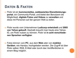 Flickr ist ein webbasiertes Dienstleistungsportal zur Verwaltung und zum Teilen digitaler Fotos und Videos, das 2005 von Yahoo übernommen wurde und eine Yahoo-ID zur Nutzung benötigt. Nutzer können zwischen einem kostenlosen und einem kostenpflichtigen Pro-Account wählen, wobei der kostenlose Account Einschränkungen beim Hochladen und in der Sichtbarkeit von Fotos hat. Das Handbuch bietet eine umfassende Anleitung zu Registrierung, Navigation, Foto-Upload, der Organisation von Alben und der Nutzung von Gruppenfunktionen.