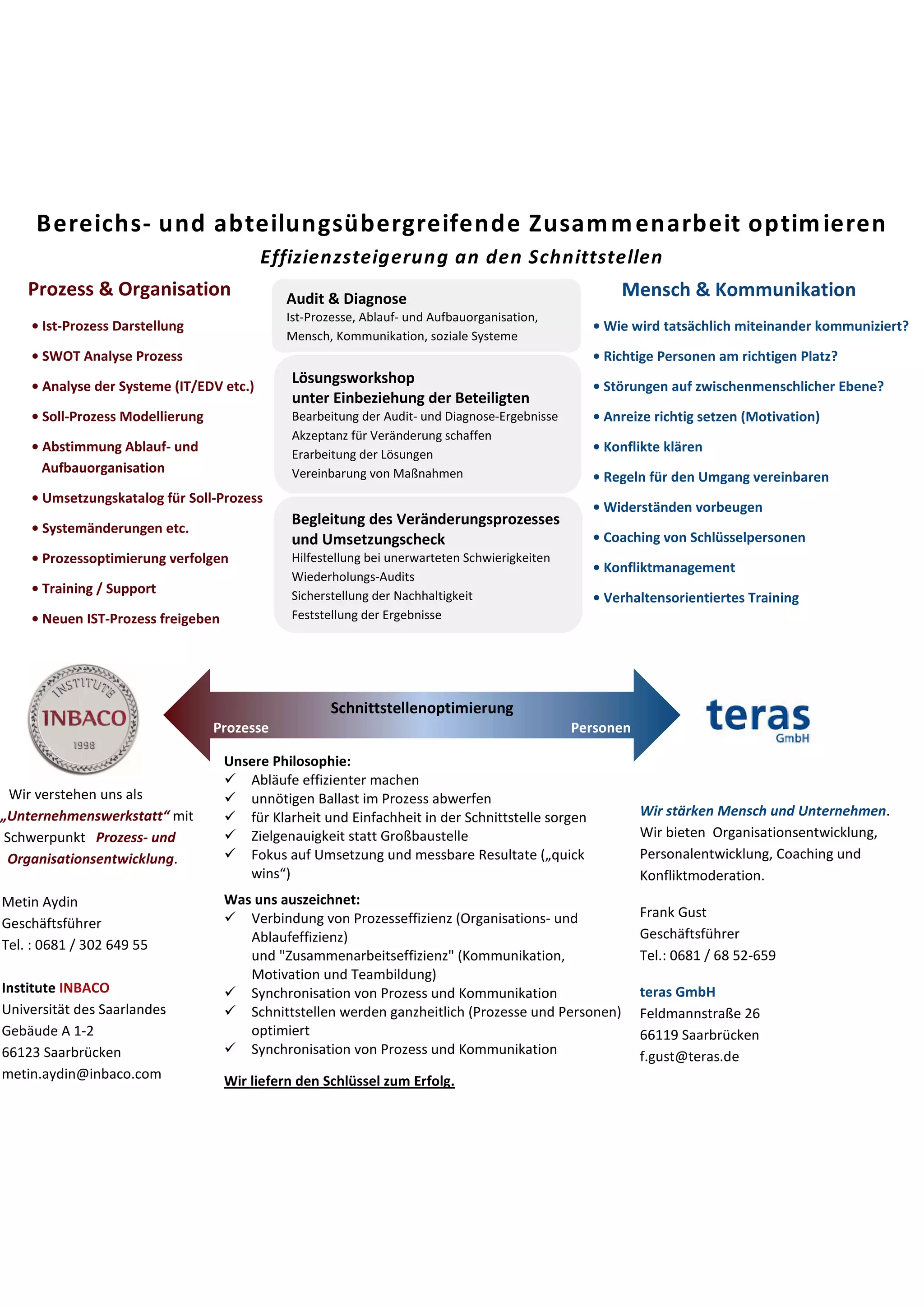 Das Dokument beschreibt Strategien zur Optimierung der bereichs- und abteilungsübergreifenden Zusammenarbeit in Organisationen, mit einem Fokus auf Effizienzsteigerung an Schnittstellen und der Verbesserung der Kommunikation. Es beinhaltet Analysen von Prozessen, die Identifizierung von Störungen auf zwischenmenschlicher Ebene sowie Maßnahmen zur Akzeptanz und Umsetzung von Veränderungen. Zudem werden Methoden zur Coaching von Schlüsselpersonen und zur nachhaltigen Implementierung von Veränderungen vorgestellt.