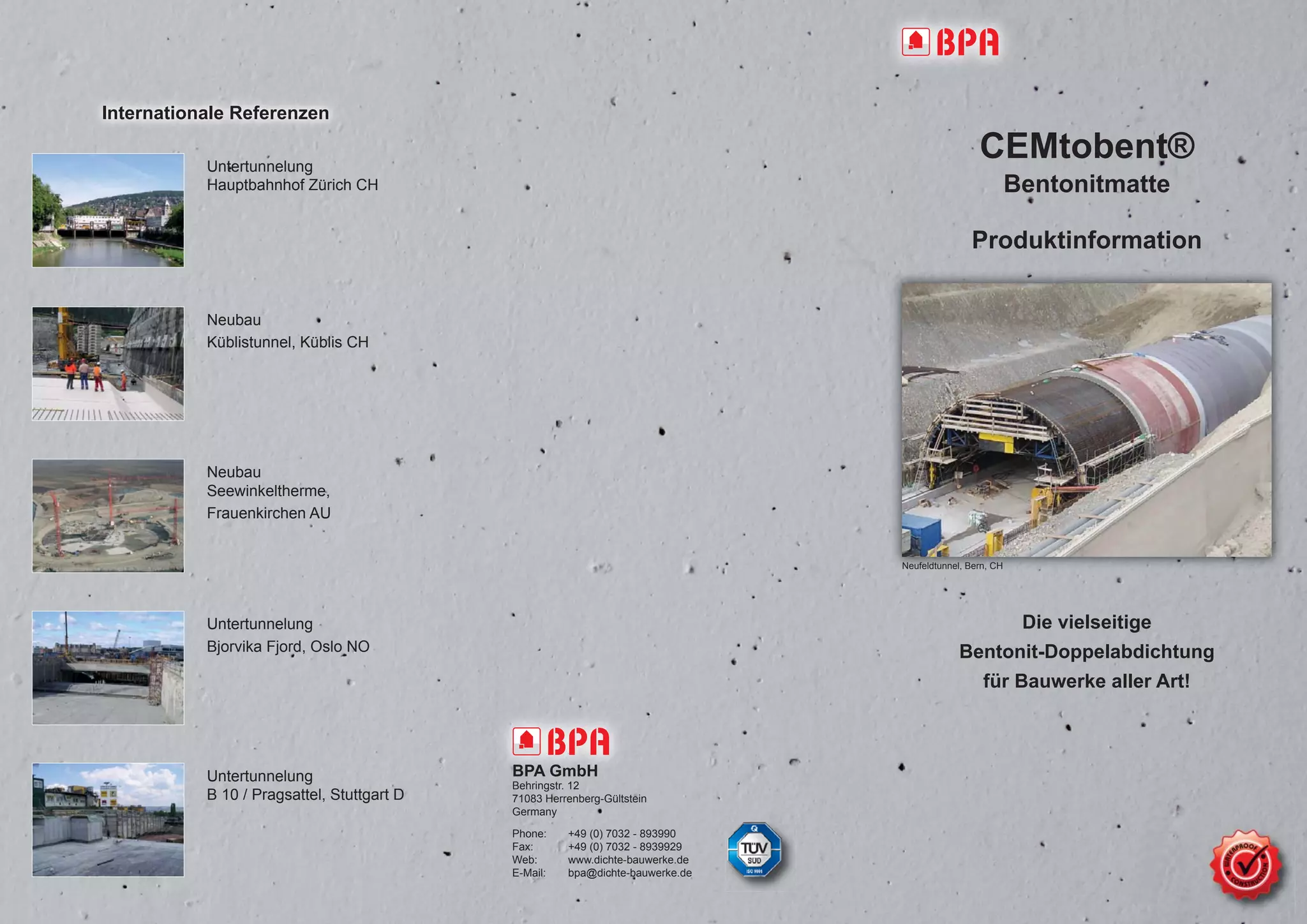 Die cemtobent® Bentonitmatte ist eine innovative Abdichtungslösung für Bauwerke und ersetzt herkömmliche Dichtungselemente durch eine selbstheilende, wasseraktivierte Abdichtung, die bei Beschädigungen der primären Abdichtung wirksam wird. Die Produkte cemtobent® ds und cemtobent® cs-plus kombinieren mehrere Abdichtungskomponenten und bieten hohe Widerstandsfähigkeit, Umweltfreundlichkeit und einfache Handhabung, auch unter schwierigen Bedingungen. Sie sind für den Einsatz im Hoch-, Tief- und Tunnelbau geeignet und schützen zuverlässig gegen eindringendes Wasser und Schadstoffe.
