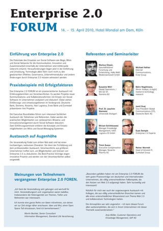 Das Enterprise 2.0 Forum fand am 14. und 15. April 2010 in Köln statt und bot einen praxisorientierten Austausch über die Anwendung von Social Software in Unternehmen zur Verbesserung von Kommunikation, Innovation und Zusammenarbeit. Referenten von namhaften Unternehmen wie Deutsche Bank, Siemens und Novartis präsentierten Fallstudien und erörterten Herausforderungen sowie Best-Practice-Ansätze für die Implementierung von Enterprise 2.0-Initiativen. Die Veranstaltung zielte auf einen intensiven fachlichen Austausch unter Experten ab und bot Einblicke in aktuelle Trends und Technologien im Bereich Wissens- und Kollaborationsmanagement.