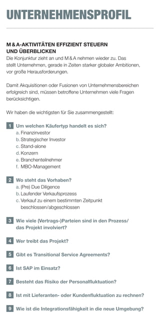 Der Dokument stellt Anforderungen und Herausforderungen im Bereich Fusionen und Übernahmen (M&A) dar, basierend auf einer Umfrage von Gartner. Es werden zentrale Aspekte wie Kulturvereinigung, Prozessmanagement, Technologie und Sicherheitsanforderungen hervorgehoben, die den Erfolg von M&A-Projekten beeinflussen. Zudem werden spezifische Fragen formuliert, die Unternehmen bei der Planung und Durchführung von M&A berücksichtigen sollten.