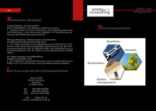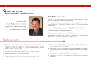 Das Dokument beschreibt die umfassenden Erfahrungen und Kompetenzen von Martin Wloka im Bereich Qualitätsmanagement, einschließlich der Beratung, Implementierung und Auditierung von Managementsystemen. Es werden Erfolge in der Qualitätssicherung und die Leitung von Zertifizierungsprojekten hervorgehoben. Wloka bietet zudem interim Management und Schulungen an, um Unternehmen bei der Optimierung ihrer Prozesse zu unterstützen.