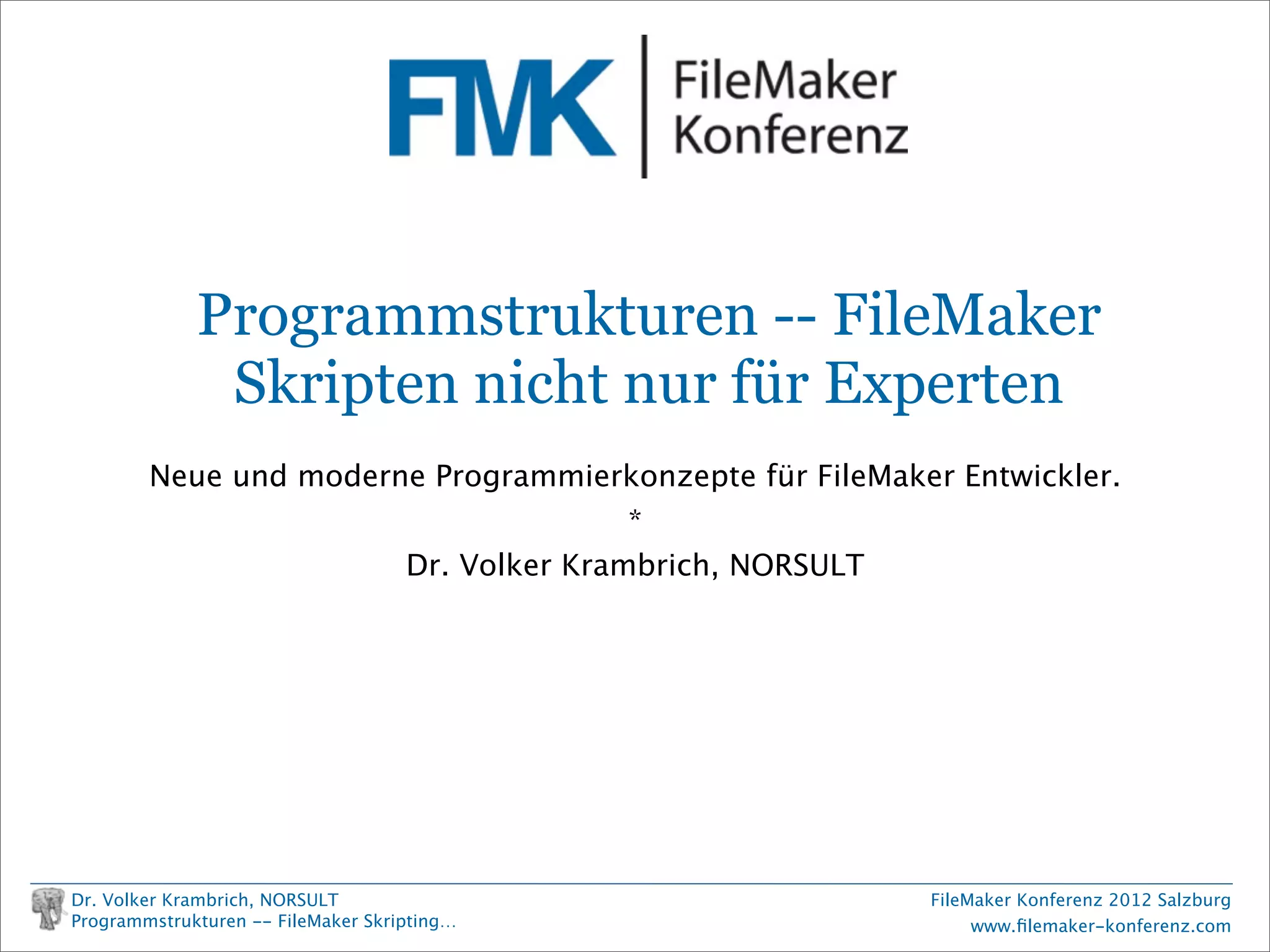 Das Dokument befasst sich mit modernen Programmierkonzepten für FileMaker-Entwickler und behandelt Techniken wie Kapselung, Vererbung und algorithmische Optimierung. Es werden praktische Anforderungen und Qualitätskriterien für FileMaker-Programme diskutiert sowie spezifische Beispiele zur Anwendung und Dokumentation von Scripts gegeben. Die Präsentation zielt darauf ab, effektive Strategien zur Programmierung und Problemlösung in FileMaker zu vermitteln.