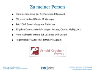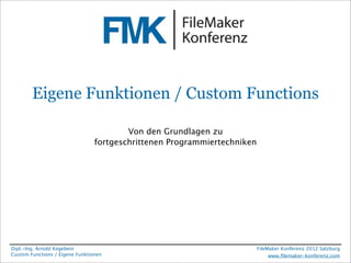 Das Dokument präsentiert eine umfassende Einführung in eigene Funktionen (Custom Functions) in FileMaker, erklärt deren Definition, Struktur und Verwendung in Programmiertechniken. Es behandelt Aspekte wie Funktionsparameter, Gültigkeitsbereiche von Variablen, fortgeschrittene Programmiertechniken sowie die Import- und Bearbeitung von Funktionen. Zudem werden Beispiele für Funktionskapselung, optionale Parameter und Rekursionen geliefert, um die praktischen Anwendungen und Vorteile dieser Konzepte zu verdeutlichen.