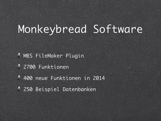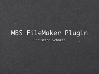 Das MBS FileMaker Plugin von Christian Schmitz bietet über 2700 Funktionen, darunter 400 neue Funktionen im Jahr 2014, sowie zahlreiche Beispiel-Datenbanken. Es unterstützt FileMaker ab Version 8.5 auf Mac OS X und Windows, einschließlich Funktionen für PDF-Druck, E-Mail-Versand und Datenbankverbindungen zu verschiedenen SQL-Datenbanken. Das Plugin ermöglicht auch erweiterte Dialogmodifikationen und asynchrone Abfragen mit verschiedenen Verschlüsselungs- und Hash-Algorithmen.