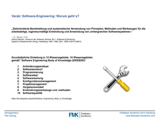 Der Vortrag auf der FileMaker-Konferenz 2015 in Hamburg behandelt die grundlegenden Prinzipien und Schritte des Software-Engineering, insbesondere in der Planung und Durchführung von FileMaker-Projekten. Es werden 10 Wissensgebiete des Software-Engineerings vorgestellt und eine strukturierte Vorgehensweise zur Anforderungsanalyse und Kundenkommunikation beschrieben, um individuelle Softwarelösungen erfolgreich zu entwickeln. Die Bedeutung von Kundenverständnis und die Identifikation von Bedürfnissen, sowohl rational als auch emotional, wird hervorgehoben, ebenso wie die Notwendigkeit, Anforderungen schriftlich festzuhalten und den Projektverlauf mit den Kunden kontinuierlich zu klären.