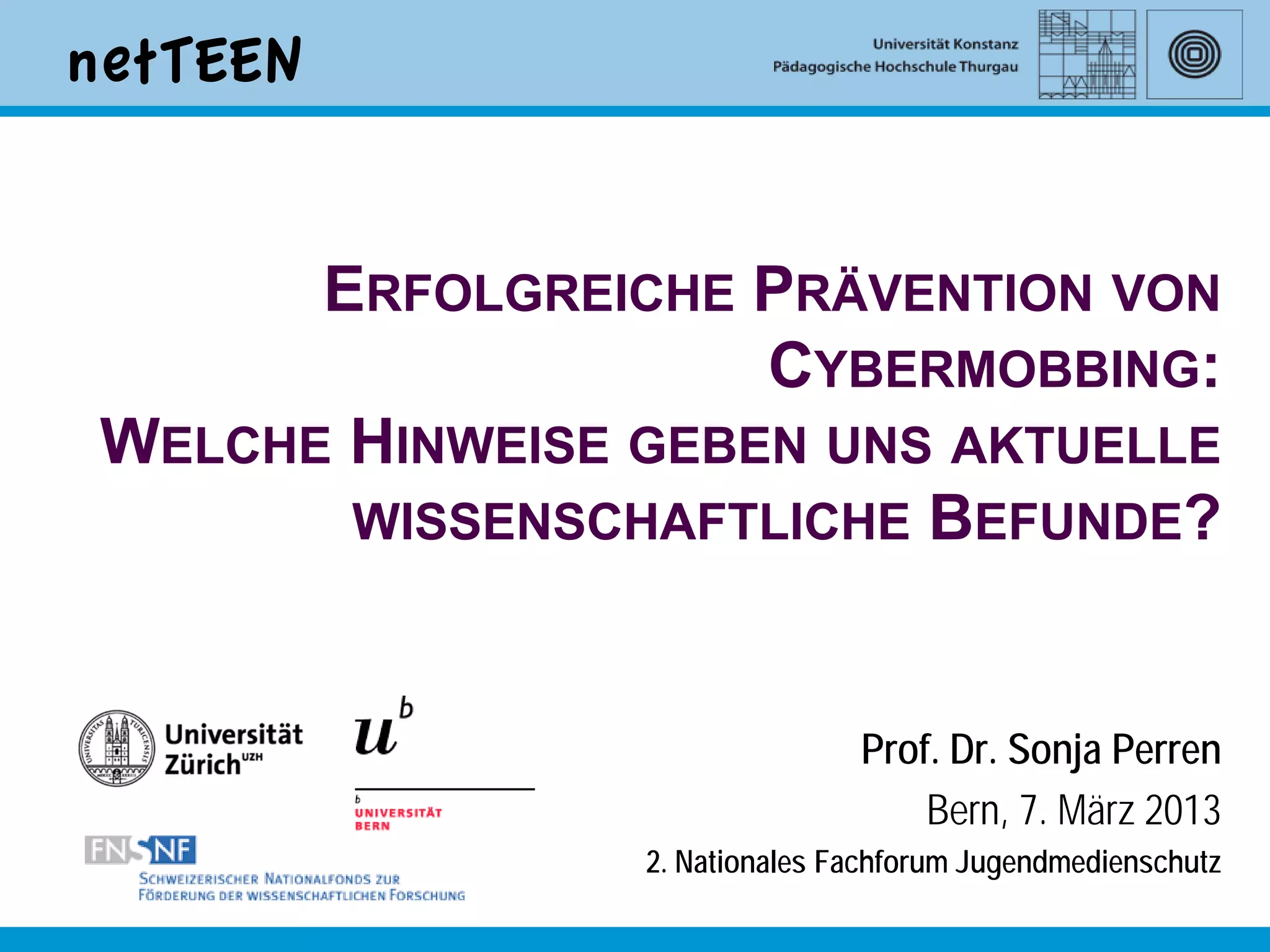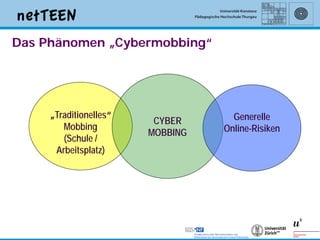 Das Dokument behandelt die Prävention von Cybermobbing und hebt die Unterschiede zwischen Cybermobbing und traditionellem Mobbing hervor, insbesondere in Bezug auf Anonymität und Öffentlichkeit. Zudem werden Risikofaktoren, die Zuschreibung von Schuld bei Opfern und die moralischen Defizite von Tätern erläutert, sowie die Notwendigkeit von Präventionsstrategien und sozialen Kompetenzen betont. Die Ergebnisse der Netteen-Studie zeigen, dass traditionelles Mobbing weitaus häufiger vorkommt, und es wird darauf hingewiesen, dass Cybermobbing oft als Spitze eines größeren Problems betrachtet wird.