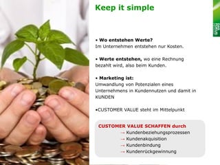 Das Dokument erläutert das Fokus-Prinzip der Marketinganalyse, das darauf abzielt, den Kundennutzen durch eine klare strategische Ausrichtung und Integration aller Unternehmensabteilungen zu maximieren. Es werden zentrale Herausforderungen und Potenziale identifiziert, insbesondere die Notwendigkeit einer klaren Unternehmensstrategie und der Fokussierung auf Kundenbeziehungen und Marktsegmente. Ziel ist es, Marketing als rentierliche Investition zu positionieren, anstatt lediglich als Kostenstelle.
