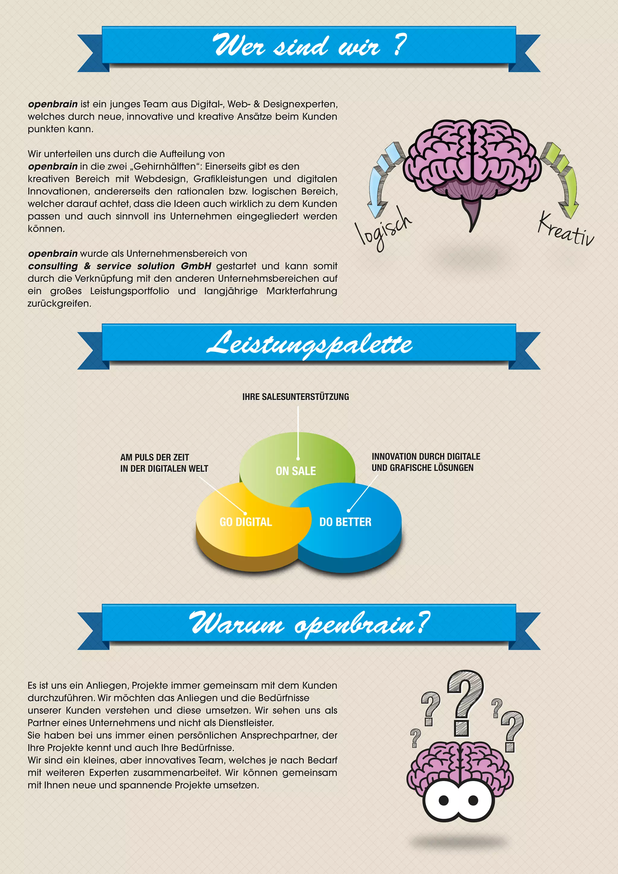 Openbrain ist ein kreatives Team aus Digital-, Web- und Designexperten, das innovative Lösungen für Kunden anbietet. Das Unternehmen legt großen Wert auf die Zusammenarbeit mit seinen Kunden, um deren Bedürfnisse zu verstehen und in Projekte umzusetzen. Openbrain, als Teil der i consulting & service solution gmbh, verfügt über ein umfangreiches Leistungsportfolio und langjährige Markterfahrung.