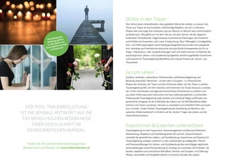 Das Dokument beschreibt die Bedeutung der Trauerbegleitung bei Verlusten und Trauerverarbeitungen, die von speziell ausgebildeten Experten angeboten wird. Die Unterstützung hilft den Betroffenen, ihre Trauer zu bewältigen, den Schmerz zuzulassen und neue Lebensperspektiven zu entwickeln. Zudem fördert die Trauerbegleitung die Resilienz und bietet eine Antwort auf die Bedürfnisse in einer sich verändernden Gesellschaft.