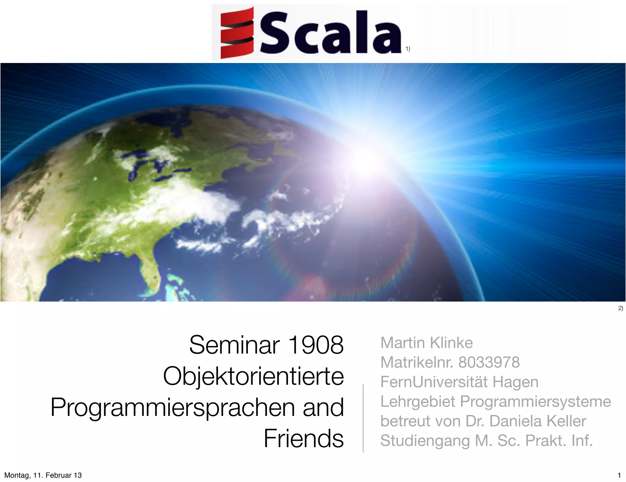 Das Dokument behandelt die Programmierung in Scala, eine Sprache, die objektorientierte und funktionale Konzepte vereint und für ihre kompakte Syntax sowie Typinferenz bekannt ist. Es erläutert das Programmiermodell, Sprachelemente, Kontrollstrukturen und spezifische Konzepte wie Traits und Metaprogrammierung. Abschließend wird Scala als vergleichsweise einfach zu erlernen bewertet, besonders für Personen mit Kenntnissen in objektorientierter und funktionaler Programmierung.